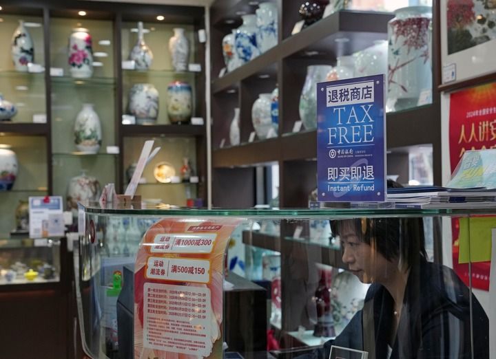 南京西路商圈的景德镇艺术瓷器商店内的离境退税标志牌。新华社记者 刘颖 摄