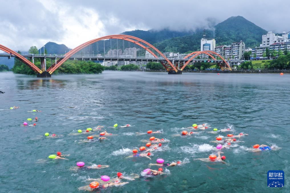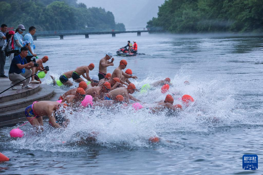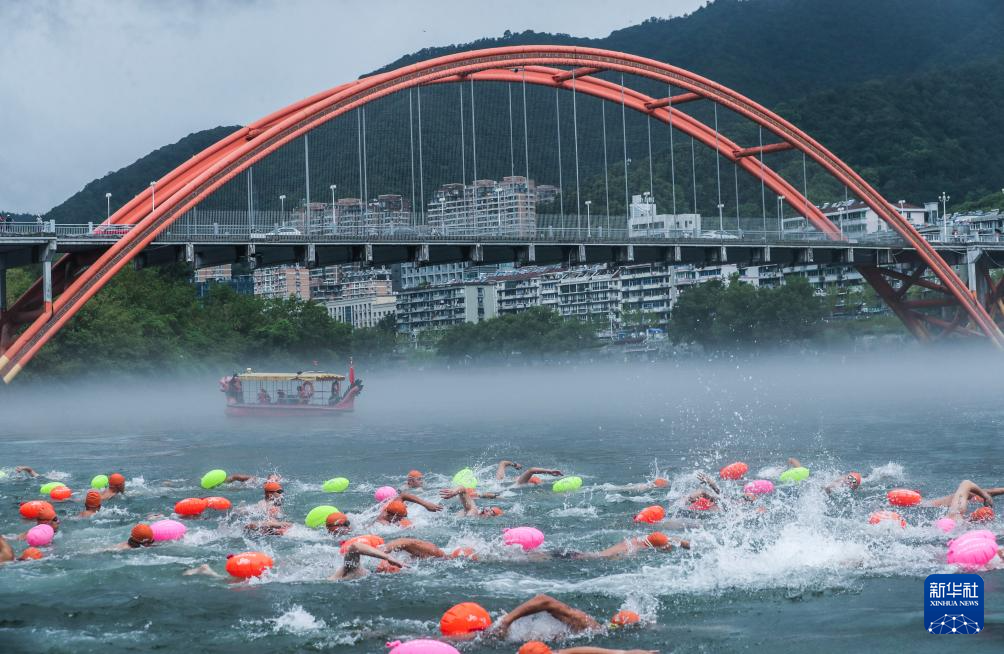 7月27日,参赛选手们跃入新安江中参加“夏日冬泳”。
