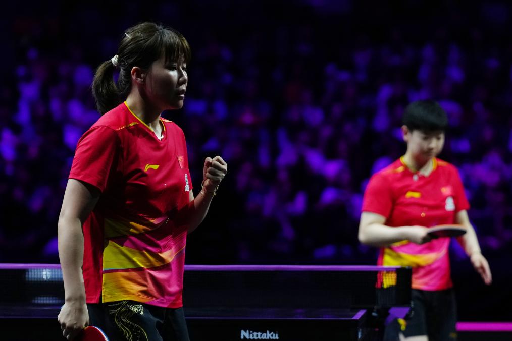 陈幸同(左)在与孙颖莎的比赛中庆祝得分。新华社记者 贾浩成 摄
