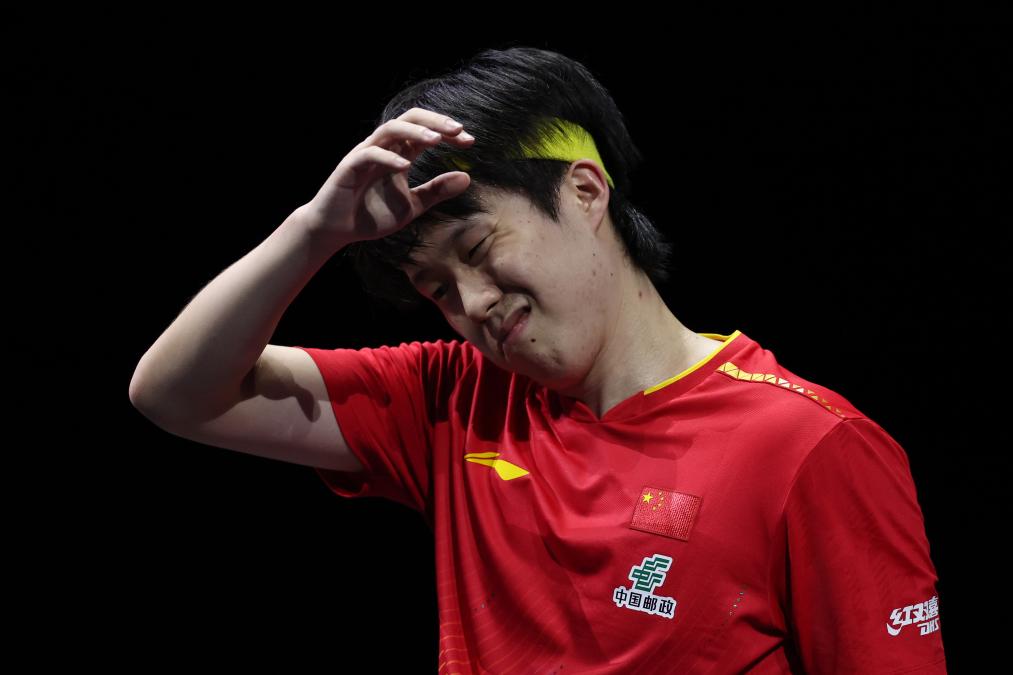 男单决赛在中国选手王楚钦和日本选手张本智和之间进行。图为王楚钦在比赛中失分后。新华社记者 贾浩成 摄