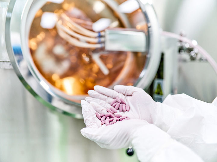技术人员在位于江苏苏州的百济神州苏州多功能产业化基地内展示产品(资料照片)。新华社发(曹梦琦摄)