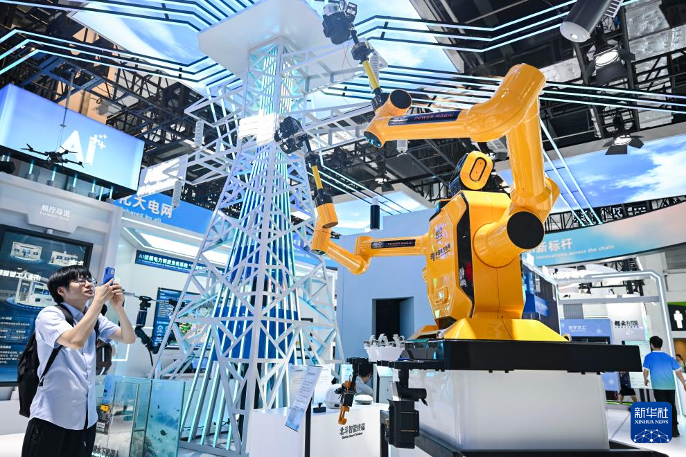参观者在2025世界人工智能大会展览现场中国南方电网展区拍摄“悟空”带电作业机器人(2025年7月28日摄)。