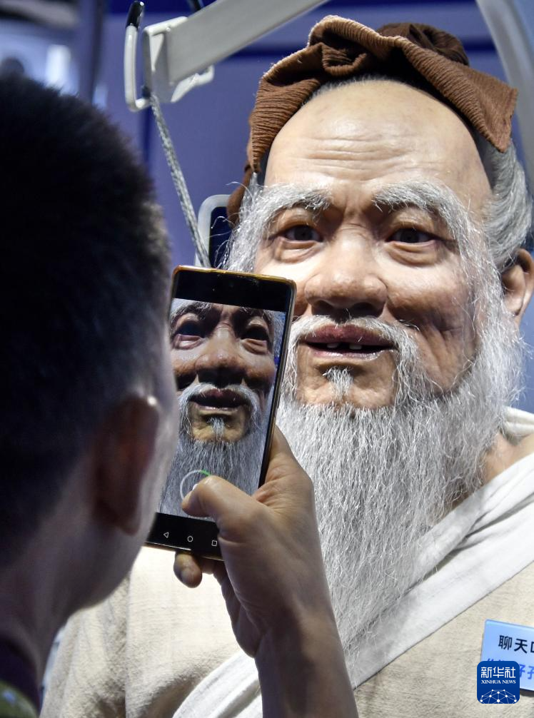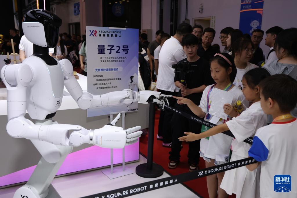 8月8日,观众在2025世界机器人大会上与一款最新发布的“量子2号”机器人互动。