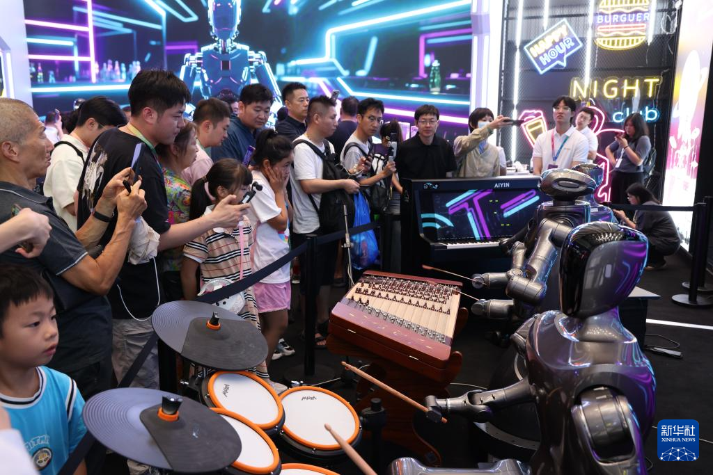 8月8日,观众在2025世界机器人大会上观看机器人乐队演奏。
