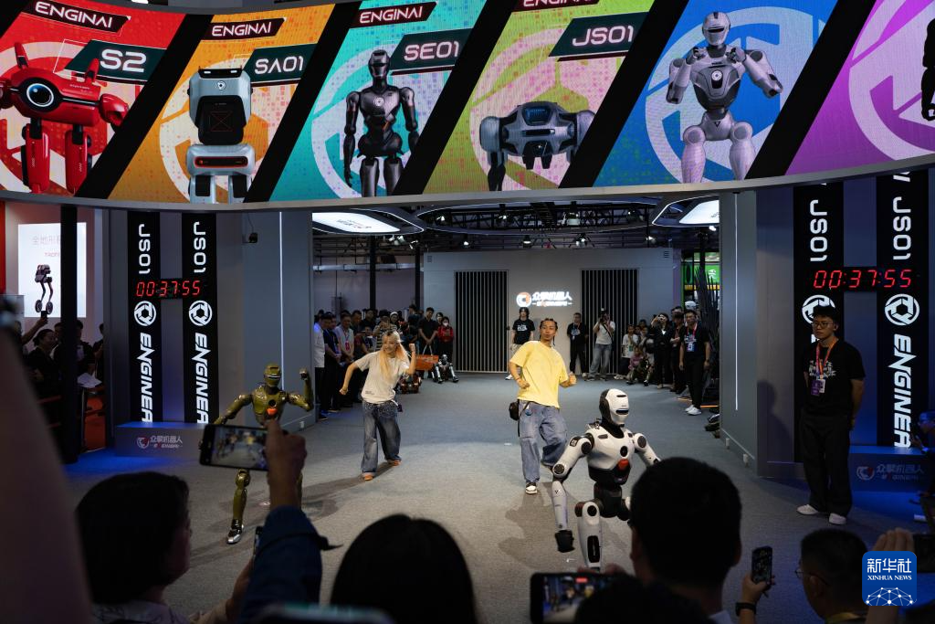 8月8日,观众在2025世界机器人大会上观看一款跳舞机器人。