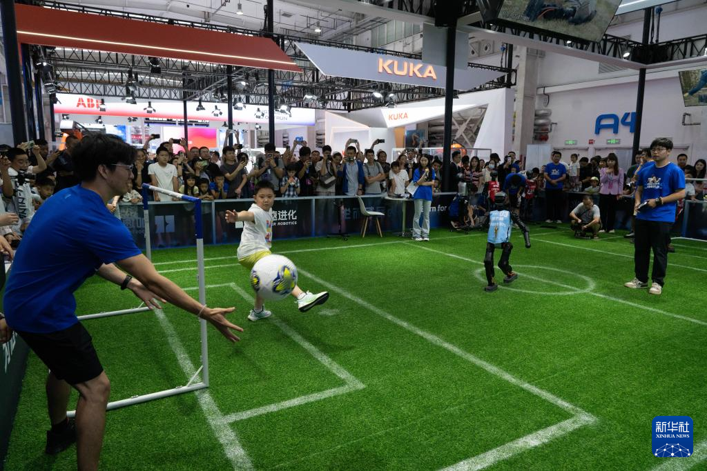 8月8日,观众在2025世界机器人大会上与机器人踢足球。