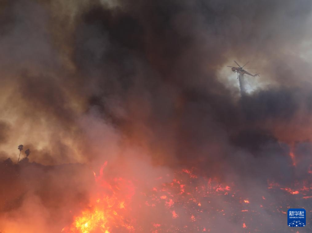8月7日,在美国加利福尼亚州文图拉县,消防直升机在山火现场洒水灭火。