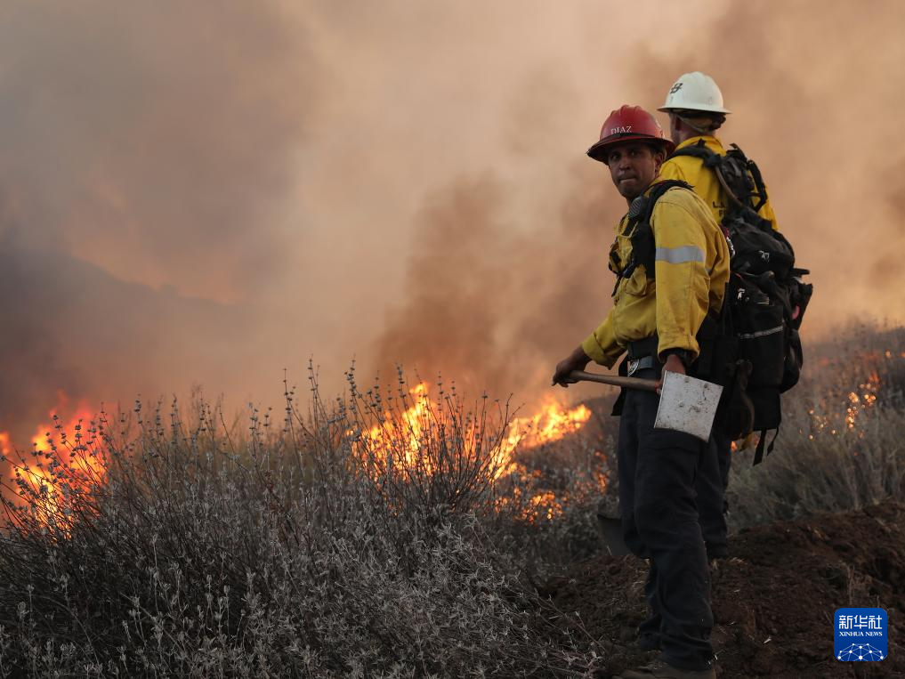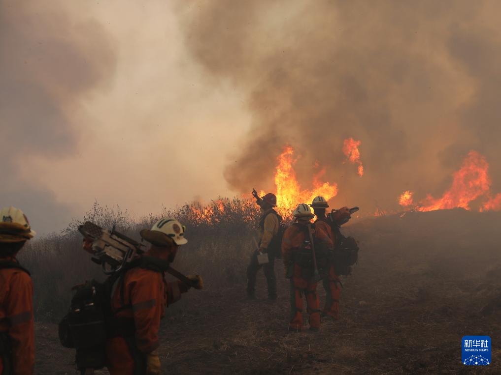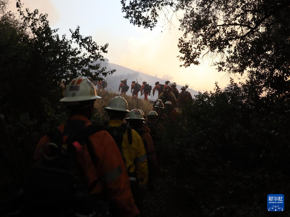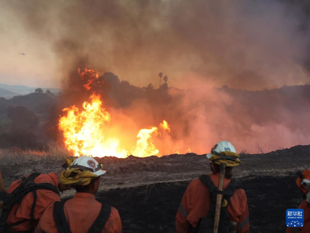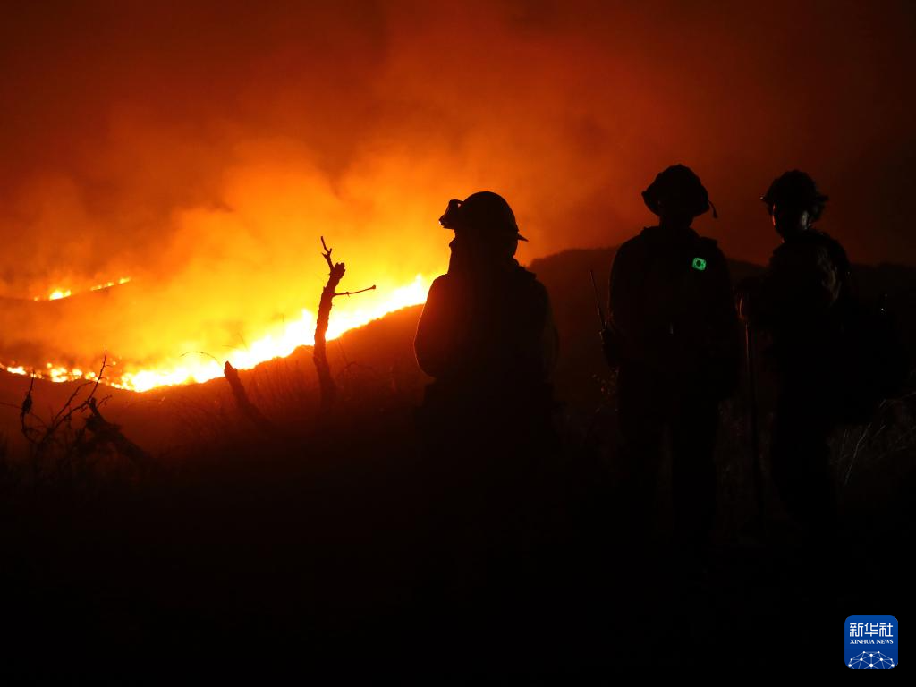 8月7日,在美国加利福尼亚州文图拉县,消防员在山火现场观察火情。