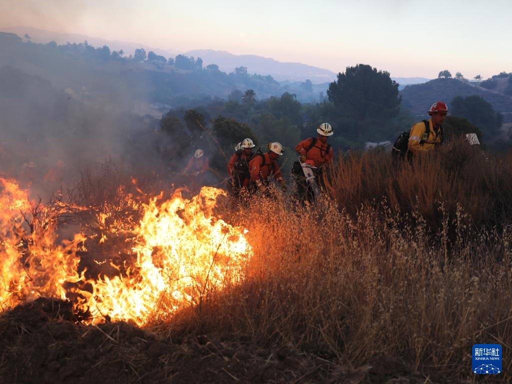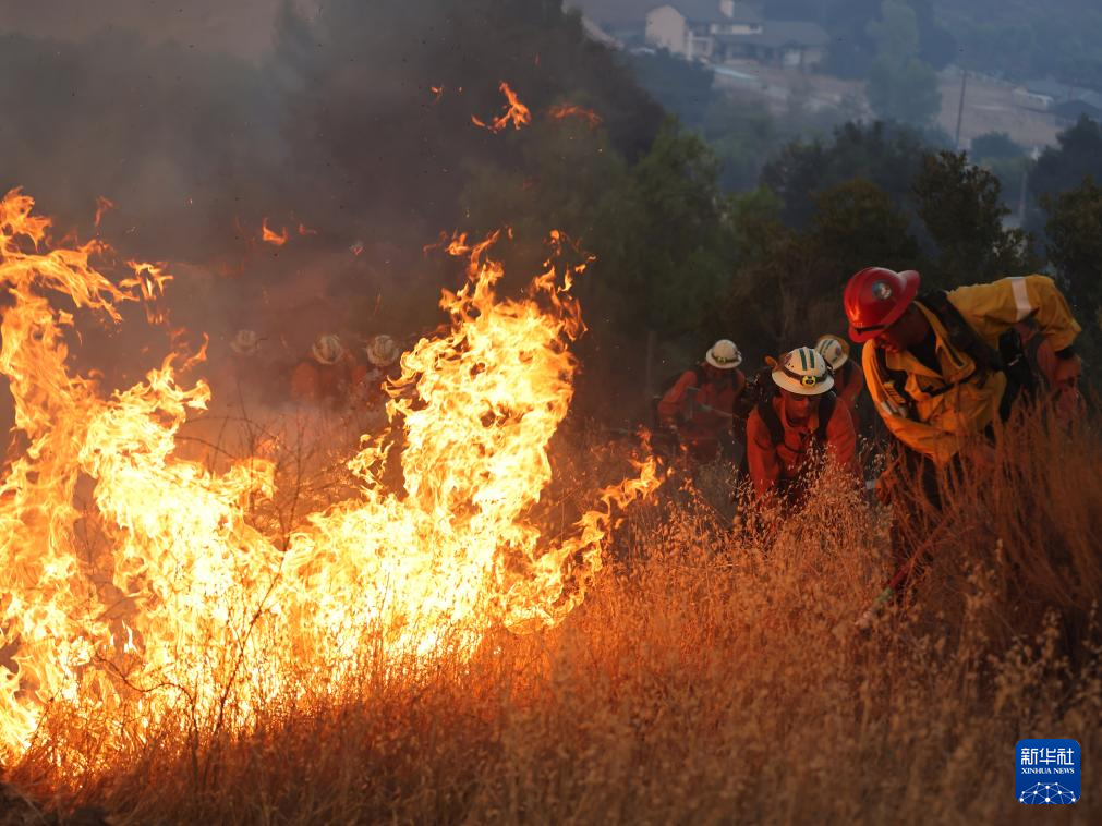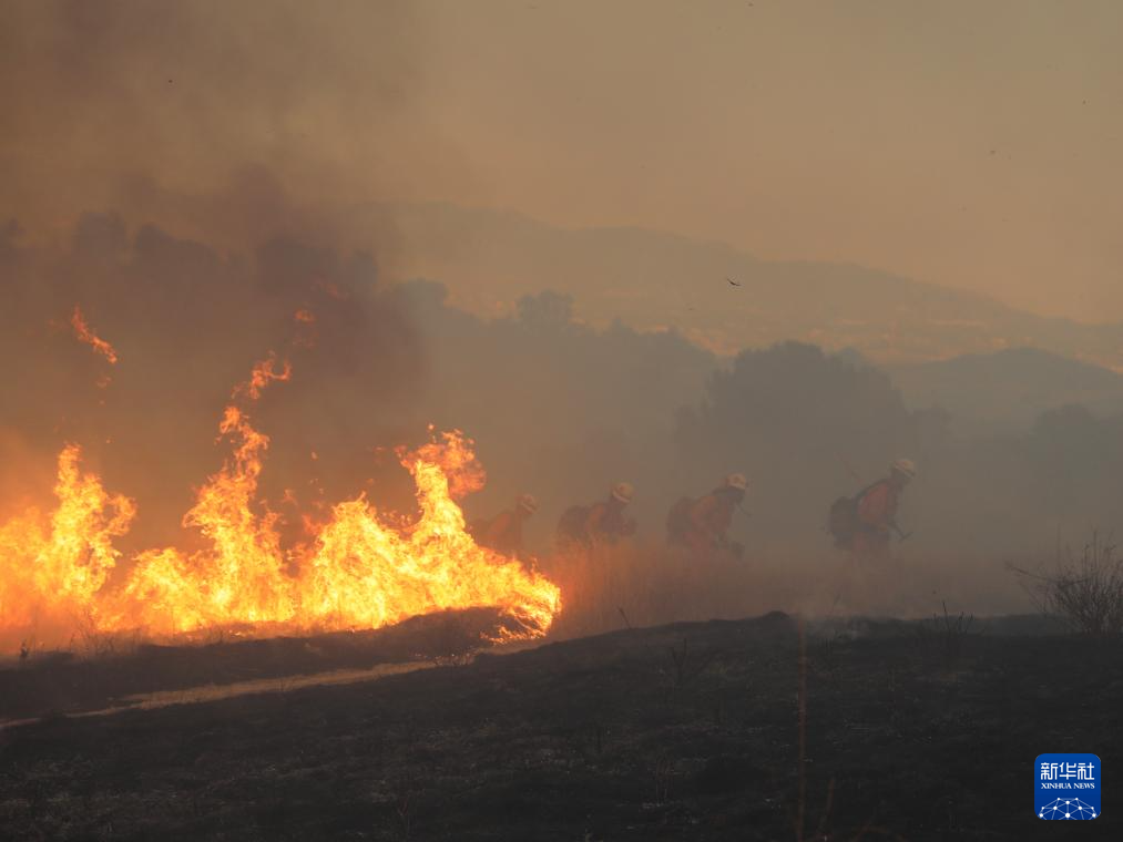 8月7日,在美国加利福尼亚州文图拉县,消防员在山火现场作业。