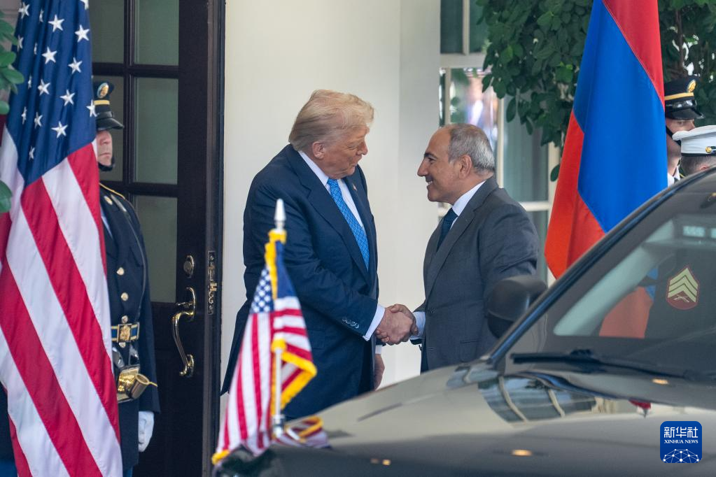8月8日,美国总统特朗普(左)在华盛顿白宫迎接亚美尼亚总理帕什尼扬。新华社记者 胡友松 摄