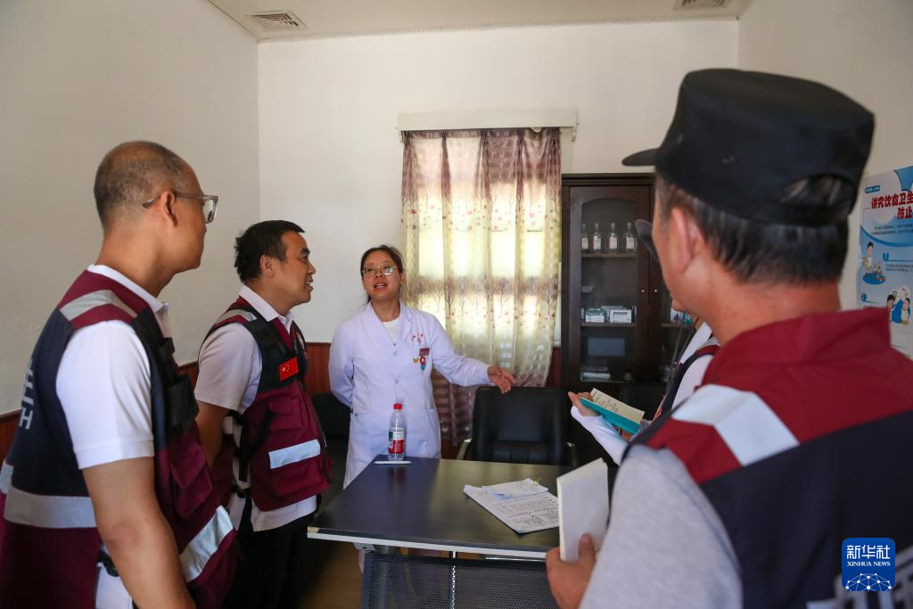 8月11日,在榆中县马坡乡上庄村临时安置点的医疗服务点,疾控人员和医护人员沟通环境消杀情况。