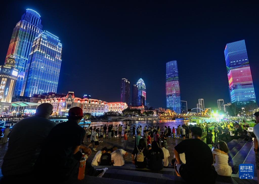 夜幕降临,海河两岸灯光璀璨绚丽,热闹非凡。市民和游客在天津海河畔漫步休闲,消暑纳凉,领略城市光影之美。