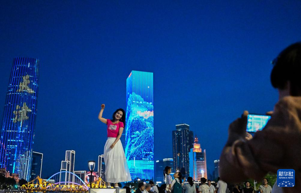 8月11日,市民游客在天津海河岸边欣赏城市夜景。