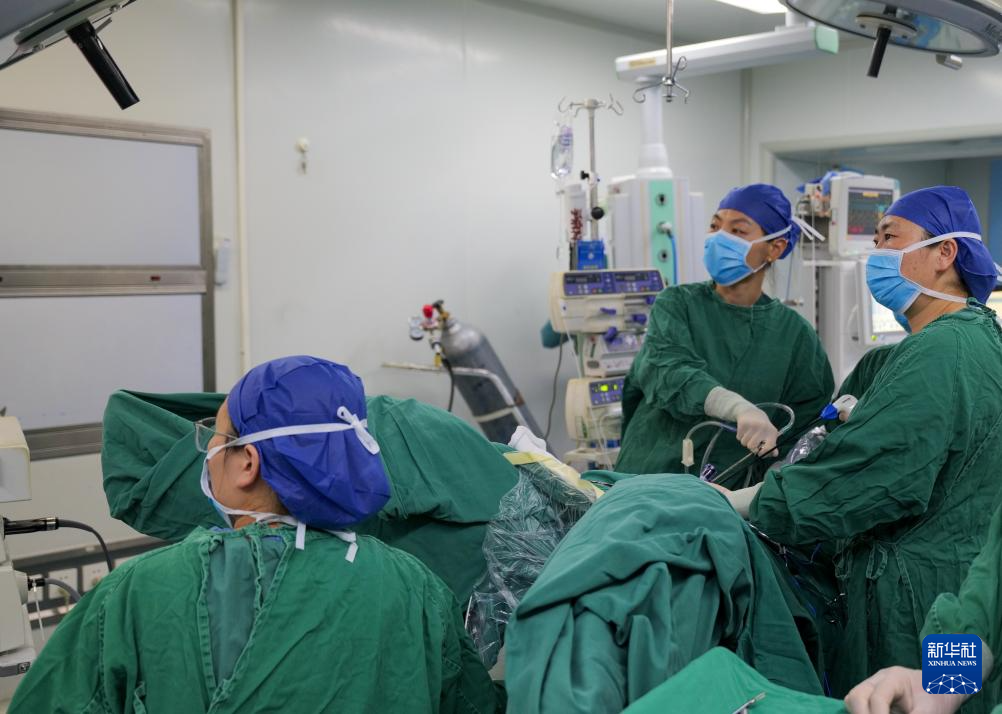 协和医院第十批援藏医生王强(左四)、第十一批援藏医生蒋青伟(左三)和西藏自治区人民医院医生扎西(左一)在拉萨为患者施行内镜逆行胰胆管造影术(8月5日摄)。