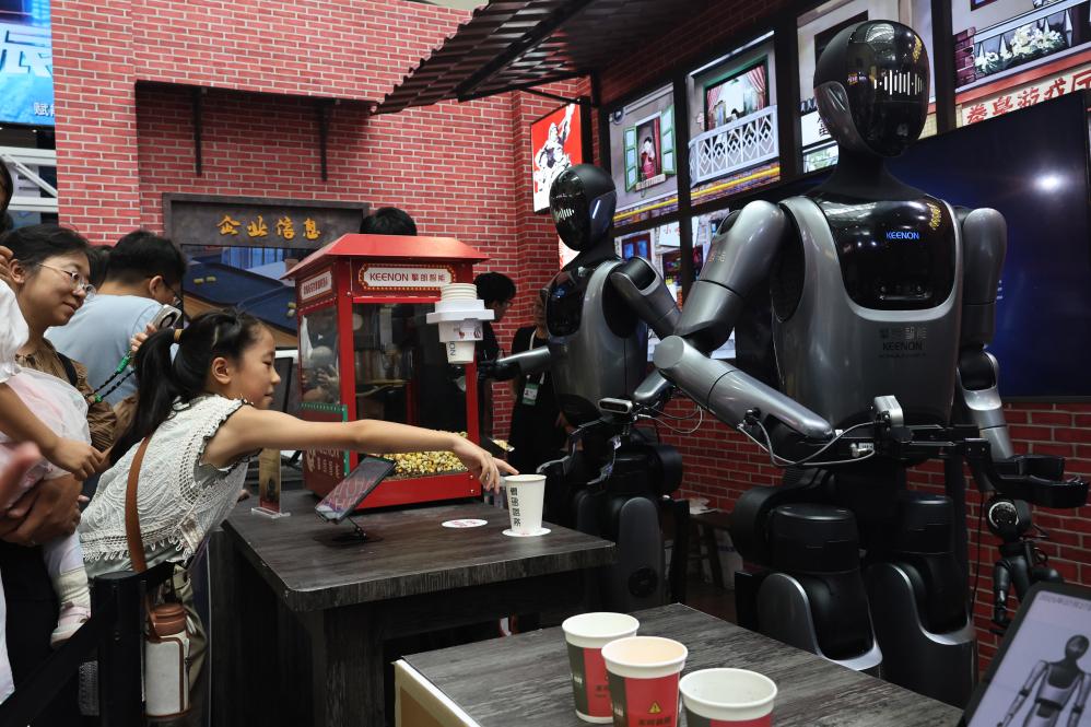 7月27日,人形机器人在展览现场为参观者提供爆米花和饮料。新华社记者方喆 摄