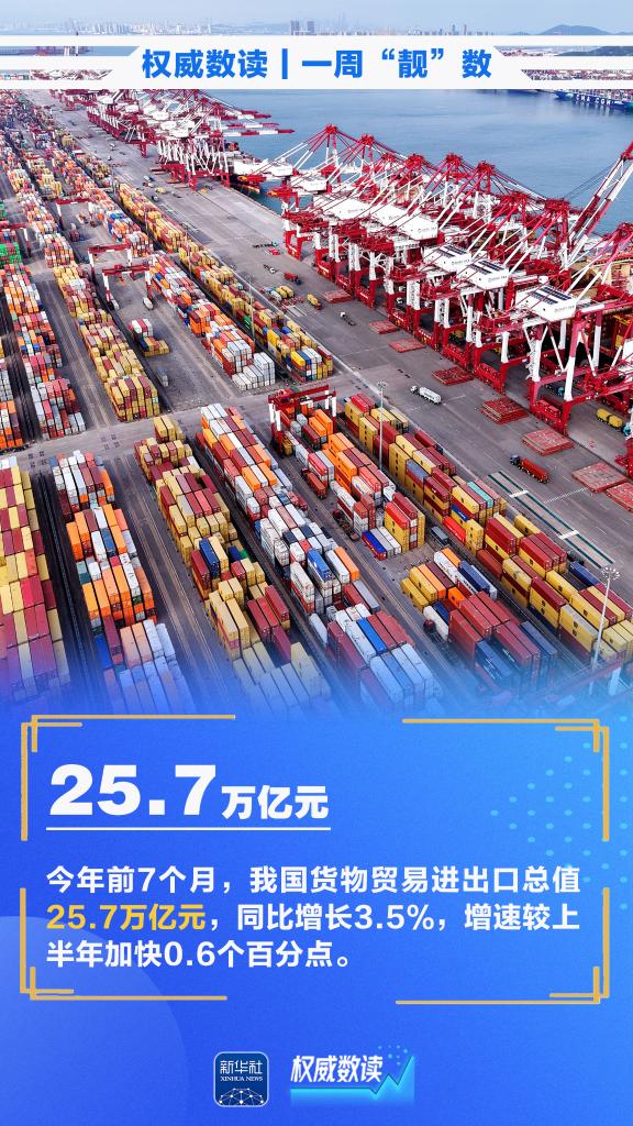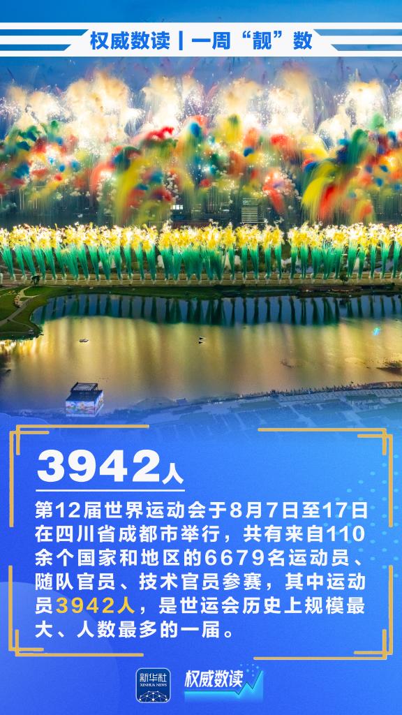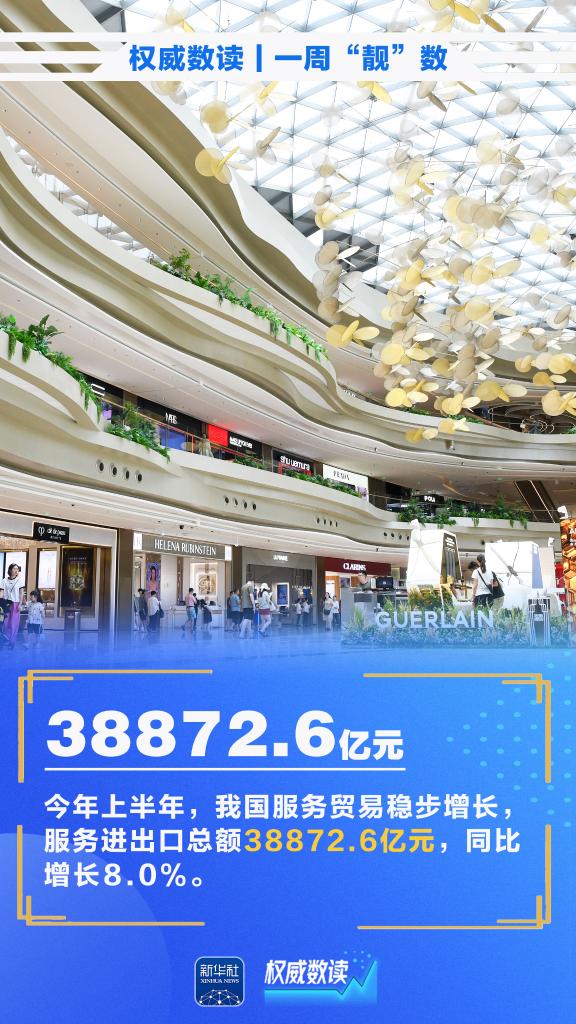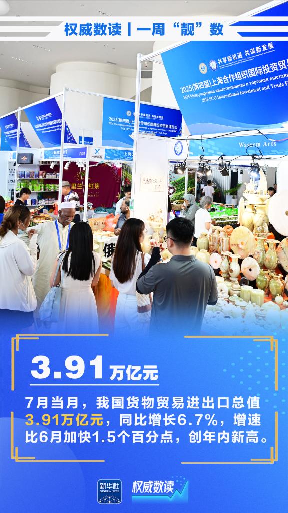 7月,我国货物贸易进出口总值3.91万亿元,同比增长6.7%;今年上半年,我国服务进出口总额38872.6亿元,同比增长8.0%;作为世运会历史上规模最大、人数最多的一届,第12届世界运动会8月7日晚在四川省成都市开幕……本周这些数据,最值得关注。