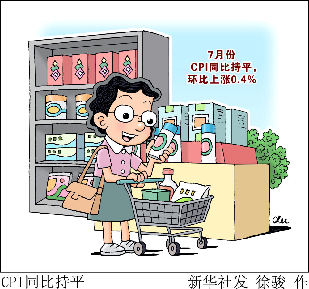 国家统计局8月9日发布数据显示,7月份,扩内需政策效应持续显现,全国居民消费价格指数(CPI)同比持平,环比由上月下降0.1%转为上涨0.4%,扣除食品和能源价格的核心CPI同比上涨0.8%,涨幅连续3个月扩大。