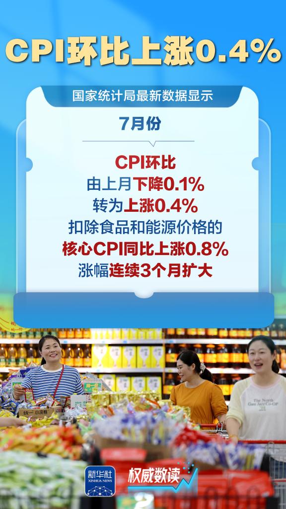 国家统计局最新发布数据显示,7月份,全国居民消费价格指数(CPI)同比持平,环比由上月下降0.1%转为上涨0.4%,服务和工业消费品价格上涨,带动作用明显,扩内需政策效应持续显现。