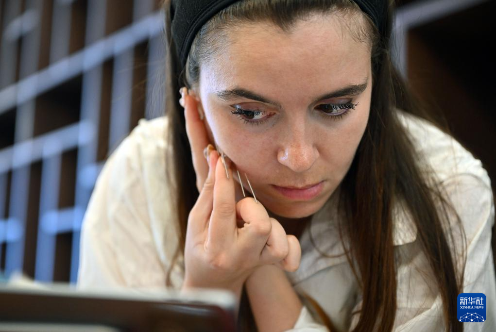8月7日,外国学员在海南省三亚市练习针灸。