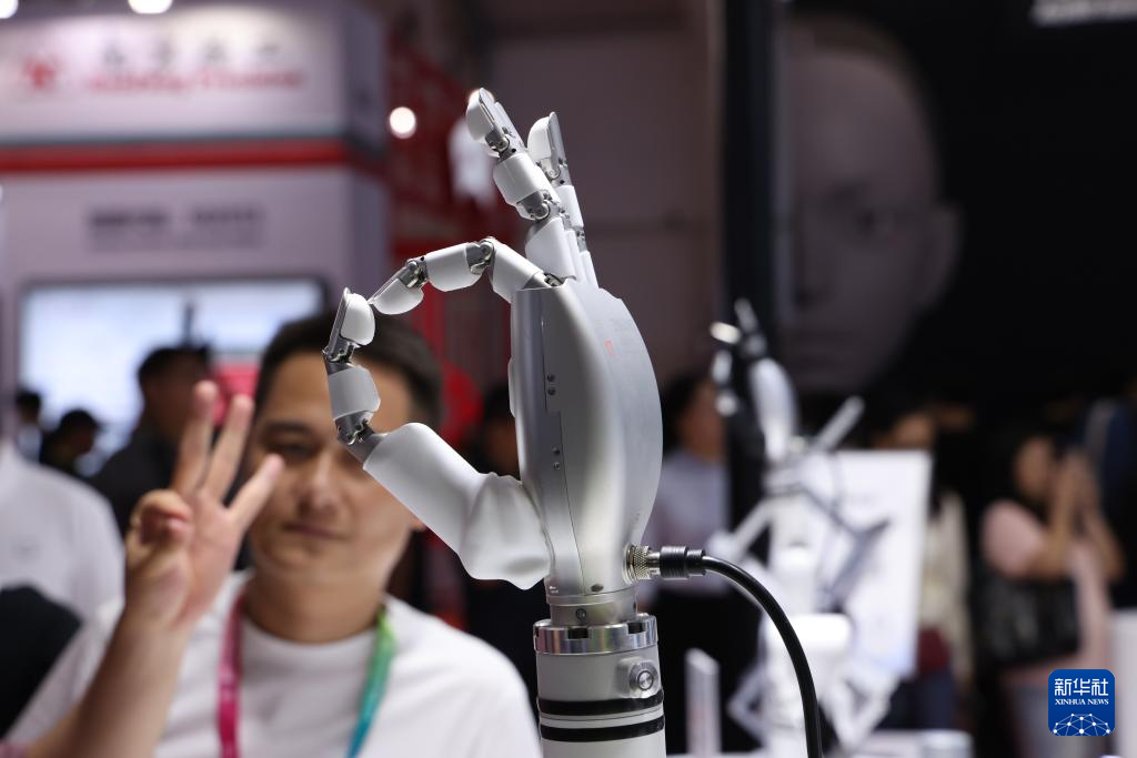 8月8日,观众在2025世界机器人大会上观看展示的一款灵巧手。