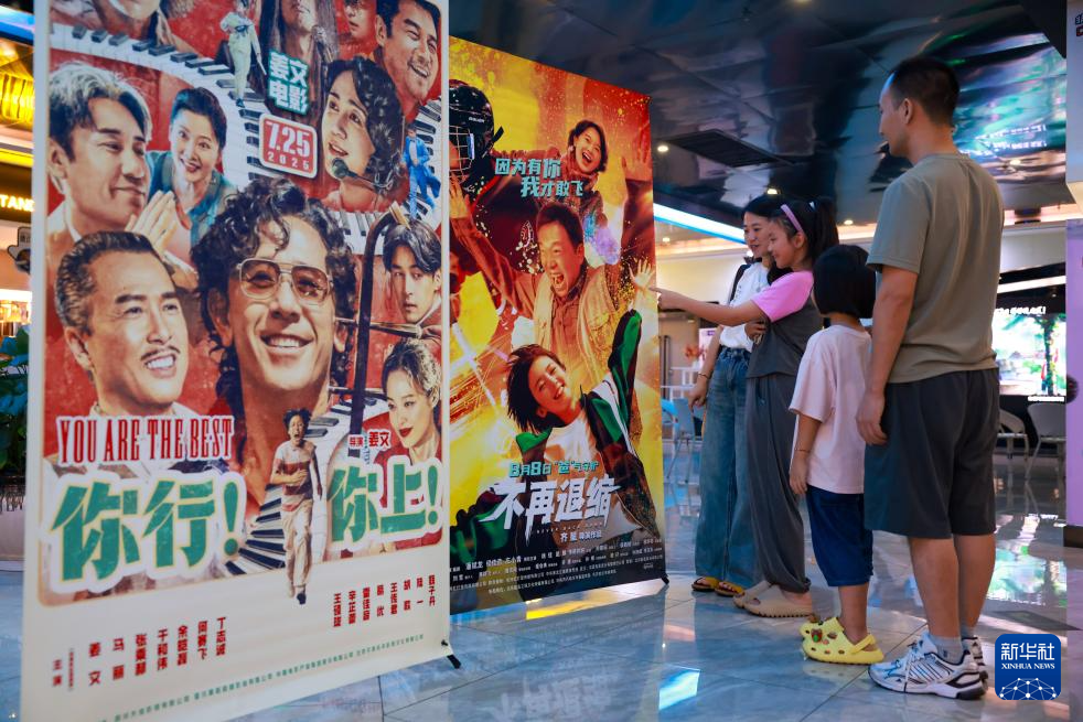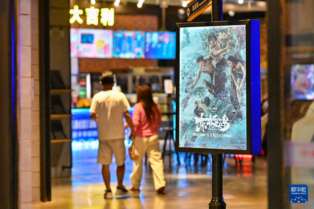 8月10日晚,观众在云南省红河哈尼族彝族自治州开远市的一家电影院内观看暑期档电影宣传海报。