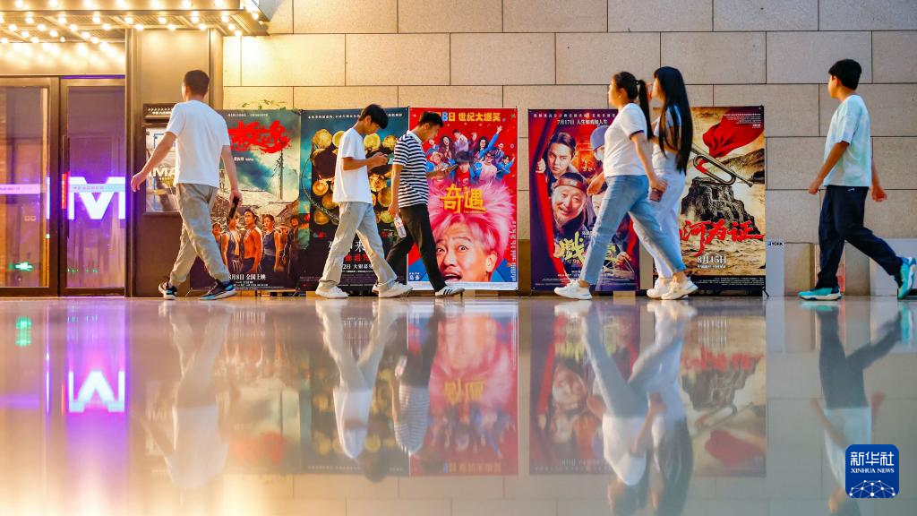 8月10日,人们从天津市滨海新区一家影城的暑期档电影宣传海报前走过。