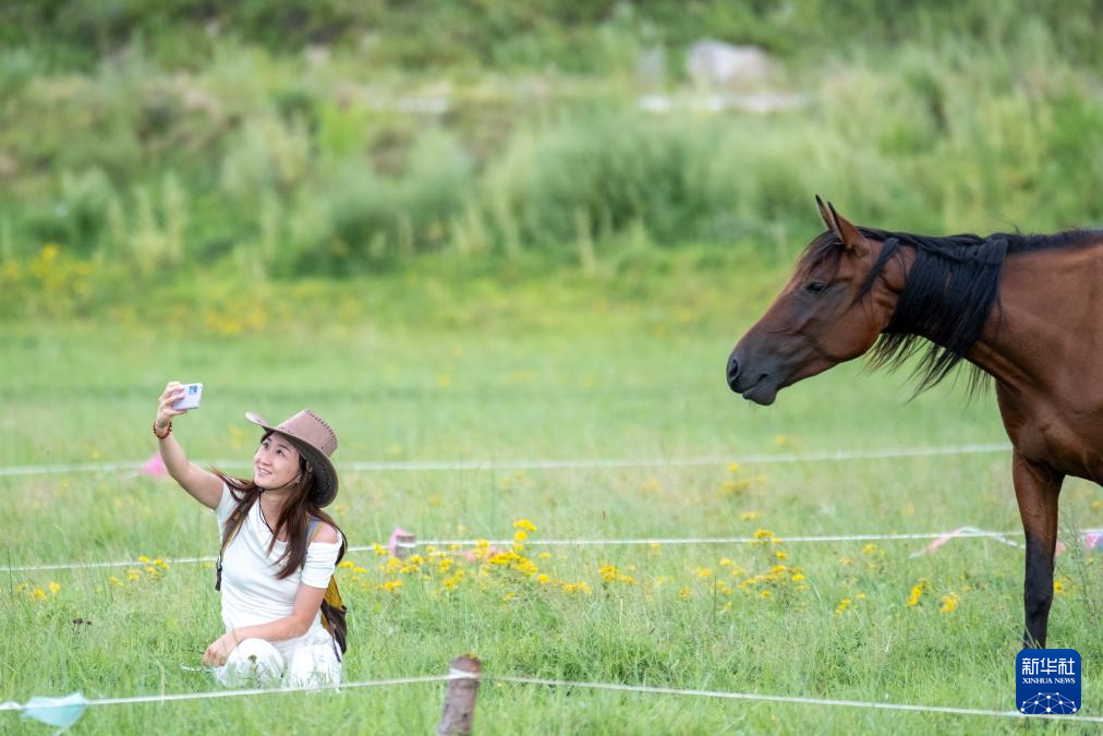 8月9日,游客在内蒙古兴安盟科尔沁右翼前旗乌兰毛都草原上和马合影。